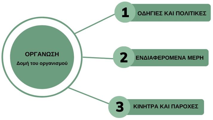 Η οργανωτική βάση ενός μοντέλου πράσινου αθλητισμού αποτελείται από διάφορα βασικά στοιχεία, όπως η ισχύουσα νομοθεσία/πολιτικές και οδηγίες, οι ενδιαφερόμενοι φορείς και το επίπεδο λειτουργίας.