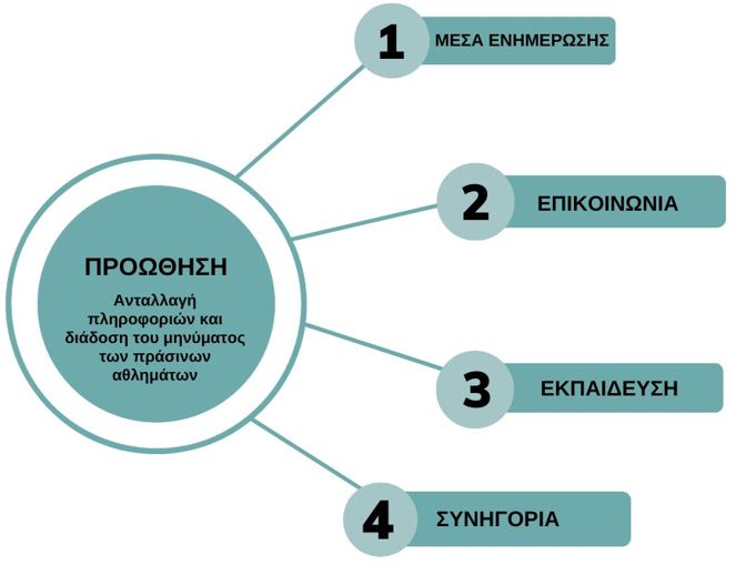 Η βάση για την προώθηση ενός πράσινου αθλητικού μοντέλου αποτελείται από διάφορα βασικά στοιχεία, όπως: μέσα ενημέρωσης, επικοινωνία, εκπαίδευση και προάσπιση.