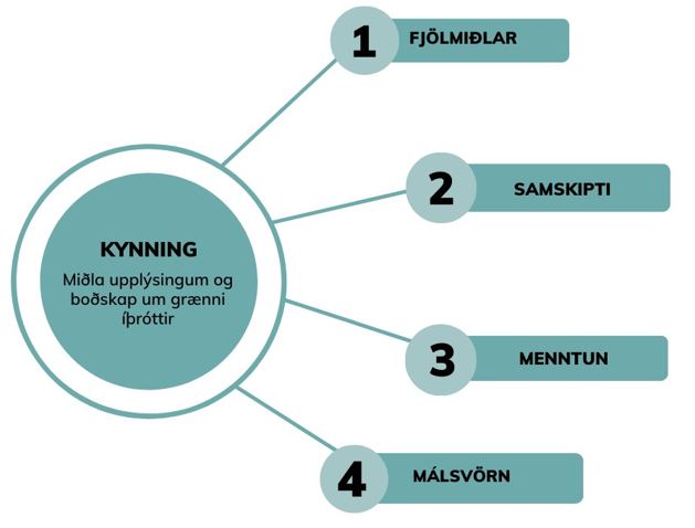 Kynning felur í sér það ferli að útdeila upplýsingum og dreifa boðskap grænna íþrótta. Kynningarstarf þarf að sníða að þörfum hvers og eins hagsmunaaðila fyrir sig og getur falið í sér upplýsingar um stefnu íþróttasamtakanna, samfélagsmiðlaherferðir, rafræn fréttabréf, ráðstefnur o.þ.h.